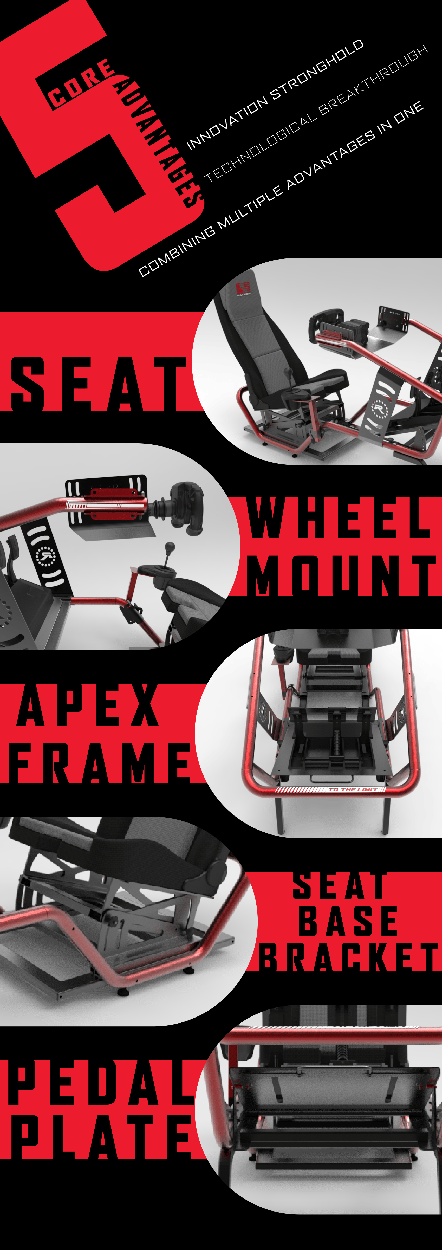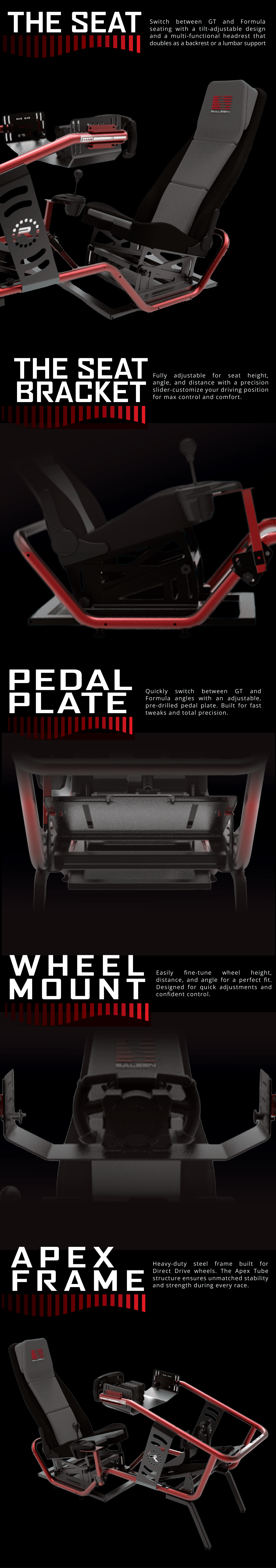 - Versatile Pedal Mount: Easily switch between GT and Formula pedal positions with the quick-adjust plate.
