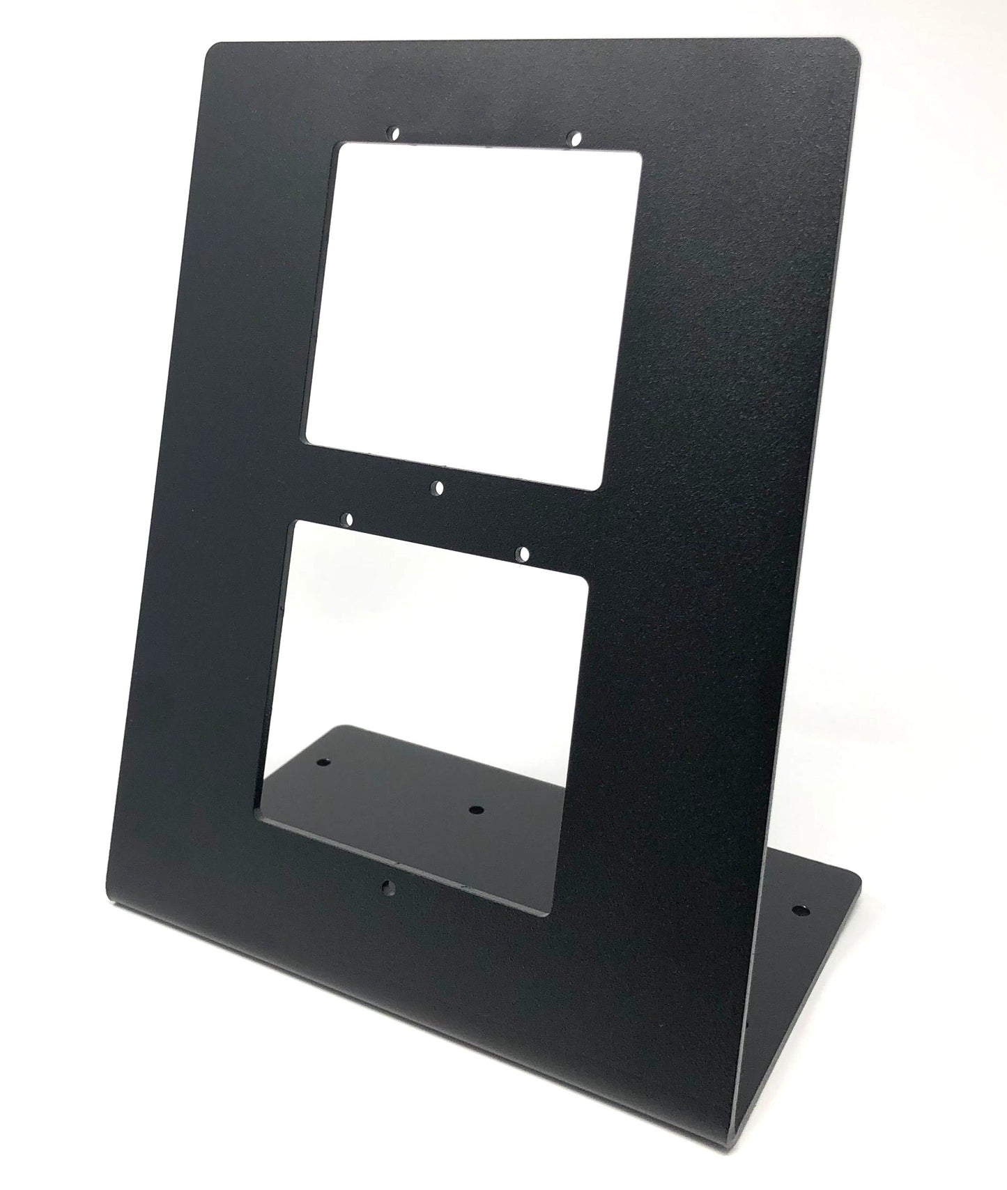 Desktop stand for the RealSimGear G5. Made from 3mm steel, powder coated matt black with rubber non-slip feet and mounting screws. The stand provides a stable, elevated mounting position for dual G5 units.