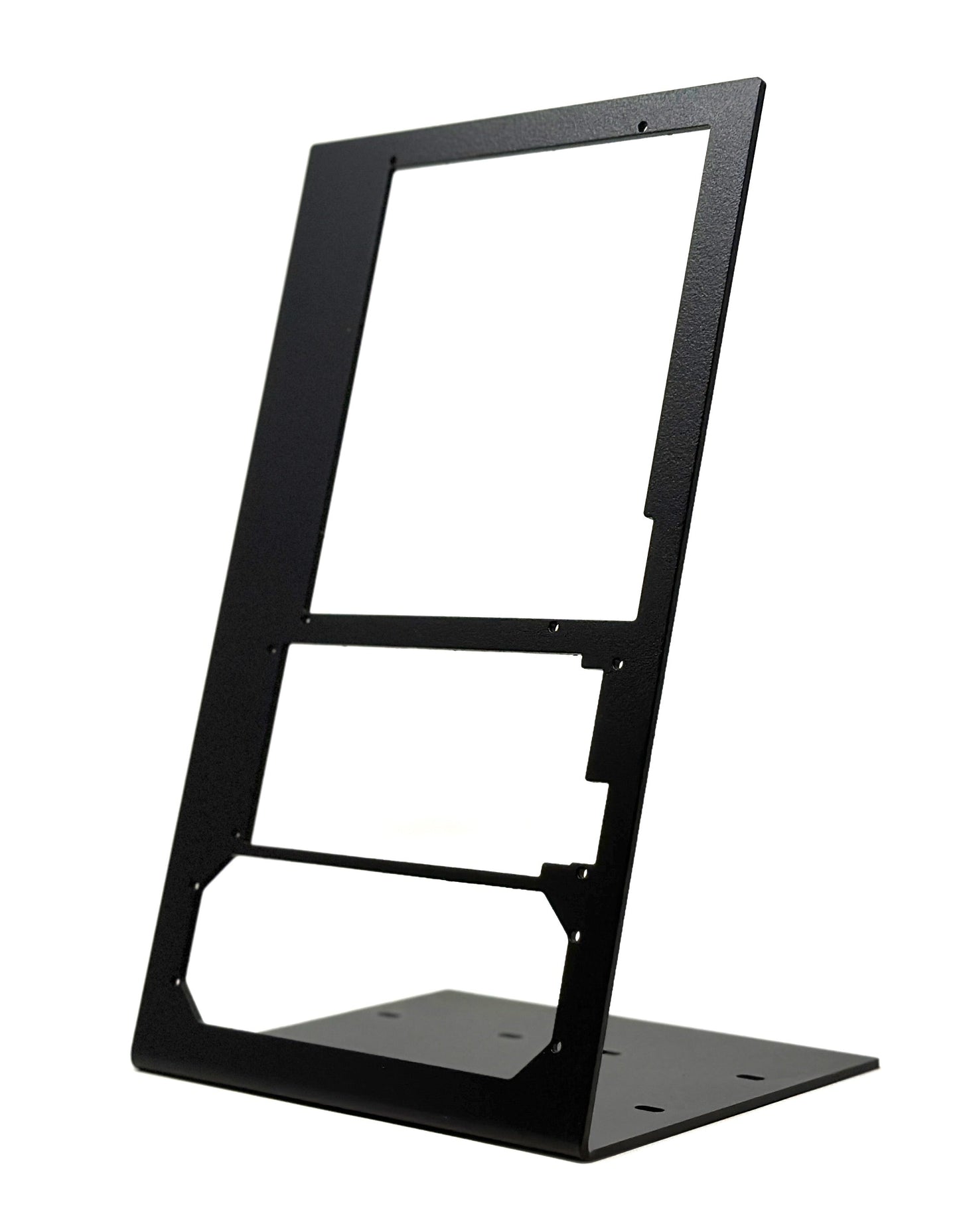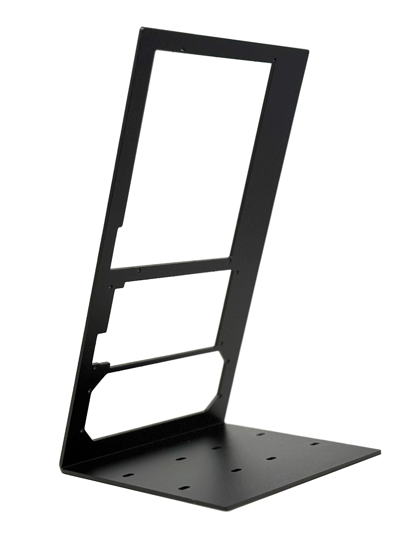 Support de bureau pour RealSimGear GTN650 , GTN750 et GFC500 . Fabriqué en acier de 3 mm, thermolaqué noir mat, il est équipé de pieds antidérapants en caoutchouc et de vis de fixation. Ce support offre une position de montage stable et surélevée pour les deux produits.
