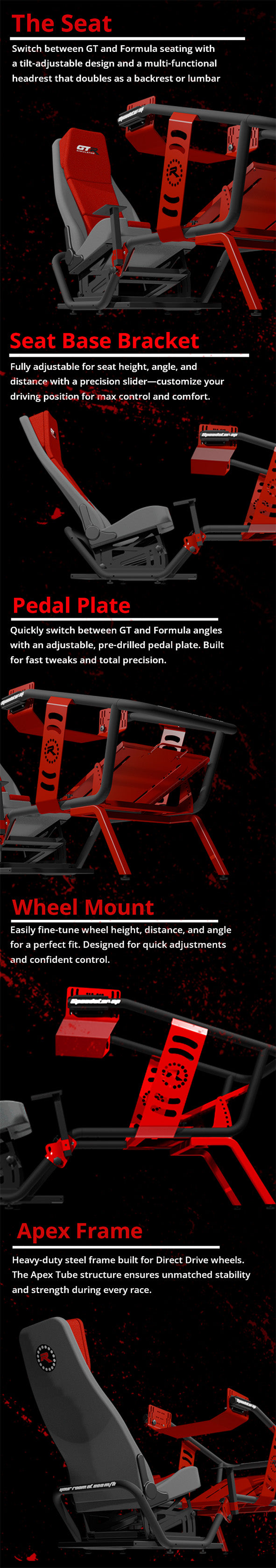 - Versatile Pedal Mount: Easily switch between GT and Formula pedal positions with the quick-adjust plate.
