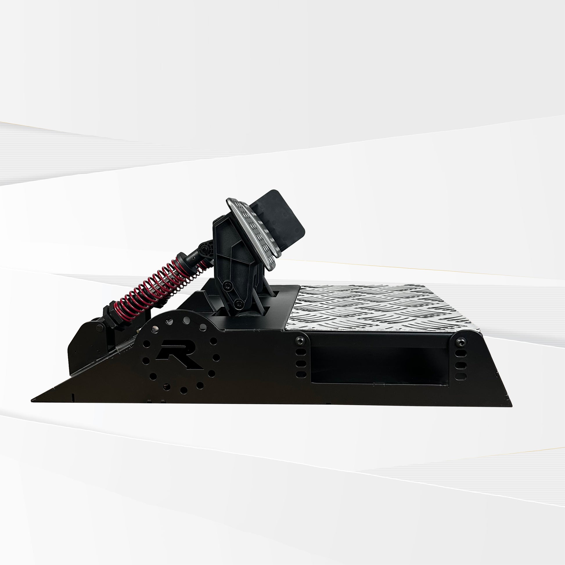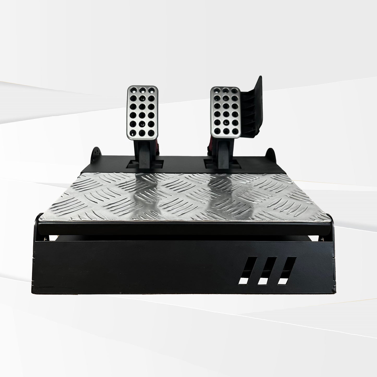 Foot pedals are constructed with spring suspension that accurately mimics real-world race car foot pedals. Foot pedal height, along with lateral positions settings (9 different lateral positions), and 4 base plate height can be adjusted to the user’s likings.
